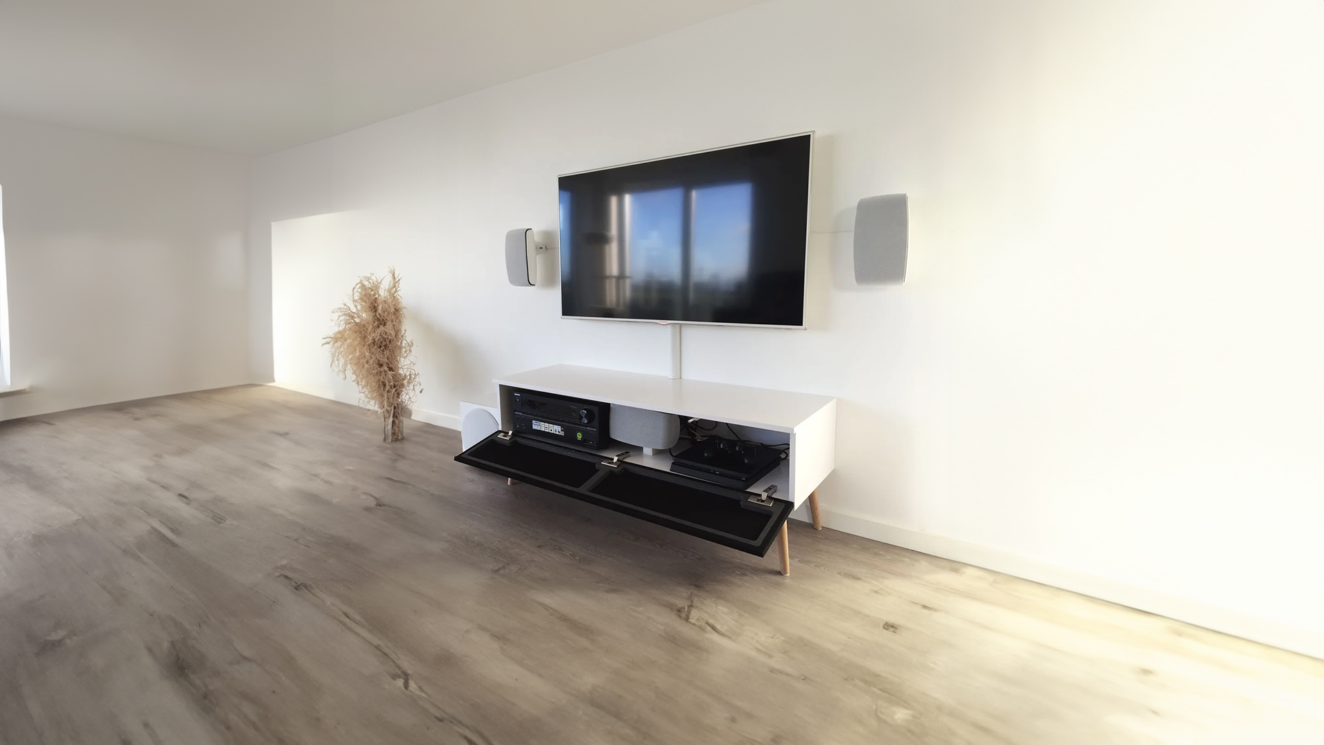 The Canvas HiFi 65” makes an instant impression with its exquisite, minimalist exterior. The 144.5 cm wide front grill, which in my case is in elegant walnut wood and adds about 30 percent to the price, fits a 65” TV perfectly and gives the impression that the speaker and TV are designed as one unit. The magnetic front cover is easily interchangeable and there are 13 different finish options in all sizes from 55“ up to 75”.