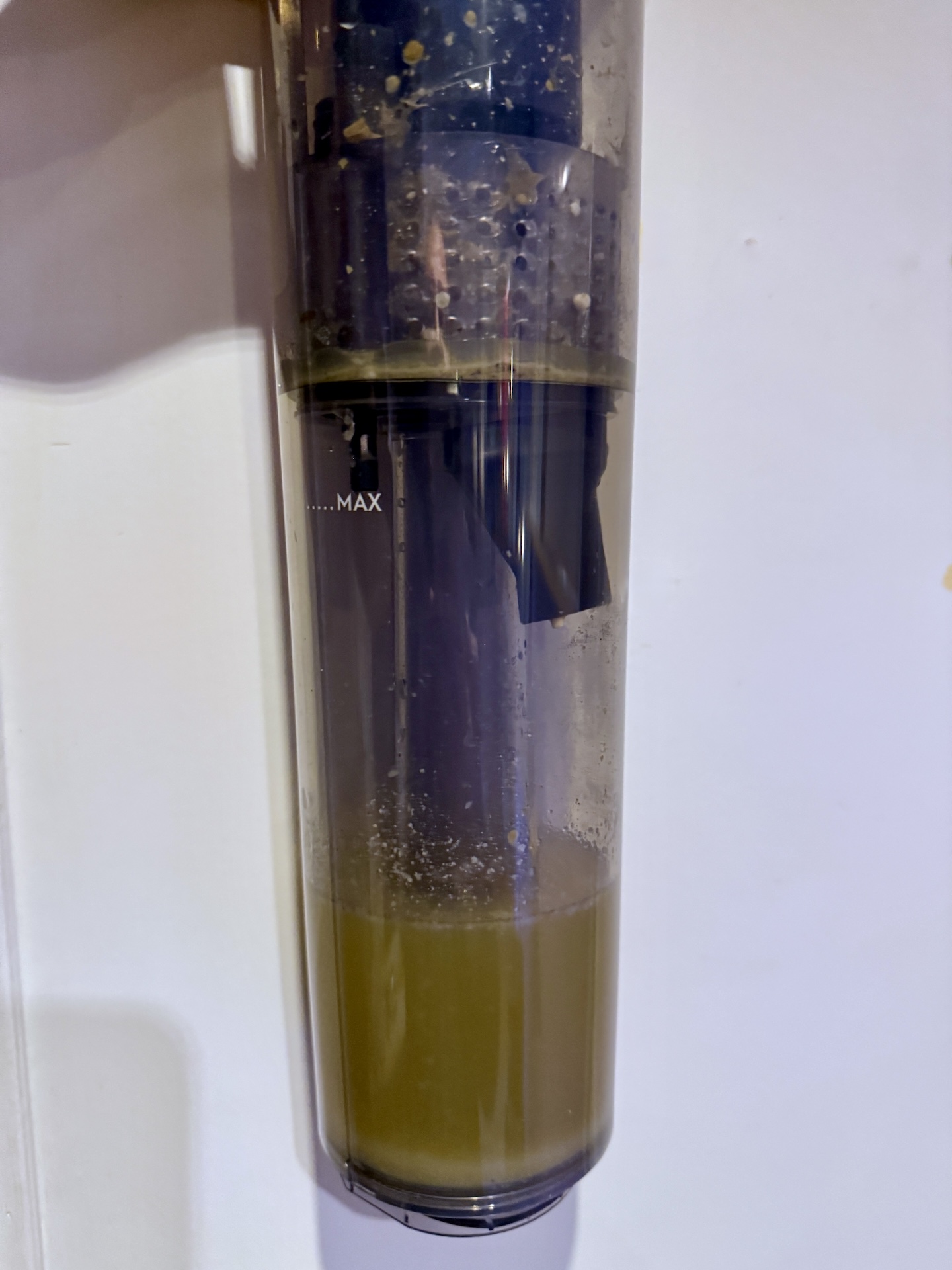 The dirty water is collected in a surprisingly large container in the centre of the mop. We didn’t really understand its purpose until it was time to empty it. It is triggered by a simple button and then you pull an insert out of the tube. It turned out that it consisted of a filter system that separates larger particles from the dirty water. Compared to previous mop solutions we’ve tried, this is nothing short of brilliant! You can just pour the dirty water down the drain like you do with the mop bucket, while you can throw the larger debris in the bin and not worry about it clogging the drain.