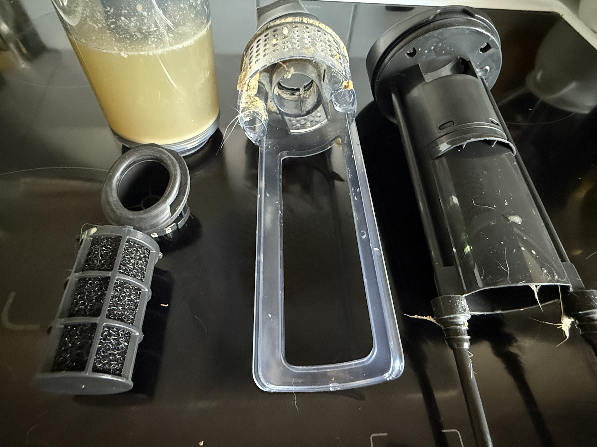 To remove the dust container, simply press the button at the bottom and pull it out. The filter insert requires loosening a small lever before pulling it out, which is an unnecessary hassle. But you’ll quickly appreciate it when you realise that the machine separates larger particles like gravel and finer ones like dust. When the nozzle on a stick vacuum cleaner rattles, we often think it will cause a blockage somewhere. Not with this solution! Why haven’t we seen this before? We also like the fact that you can rinse the filters under the tap to make them last longer.
