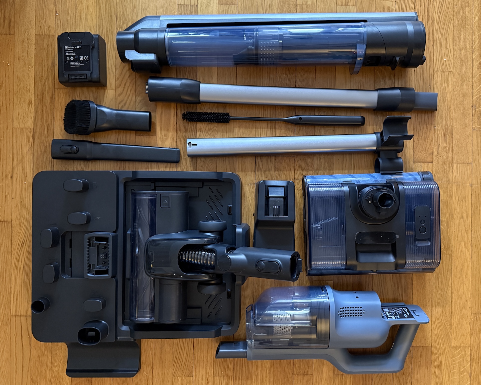 Something more high-tech is the mopping machine. It uses two counter-rotating brush rollers, a solution we’ve seen before with the Dyson WashG1. It’s an effective solution and we appreciated that Electrolux left a significantly drier floor. Something that usually causes problems is large dried-on stains. Not much actually happened when we dragged the machine back and forth over one. But then we remembered the spray button on the handle. A few presses and the stain was soaked in water with detergent. We tilted the handle up so that the machine stood on its own, switching off the motor. A little later, we came back and washed the stain again and the result was a sparkling clean floor. And knowing that we wouldn’t have to deal with the mess later on almost made us long for the next time the cat got sick!