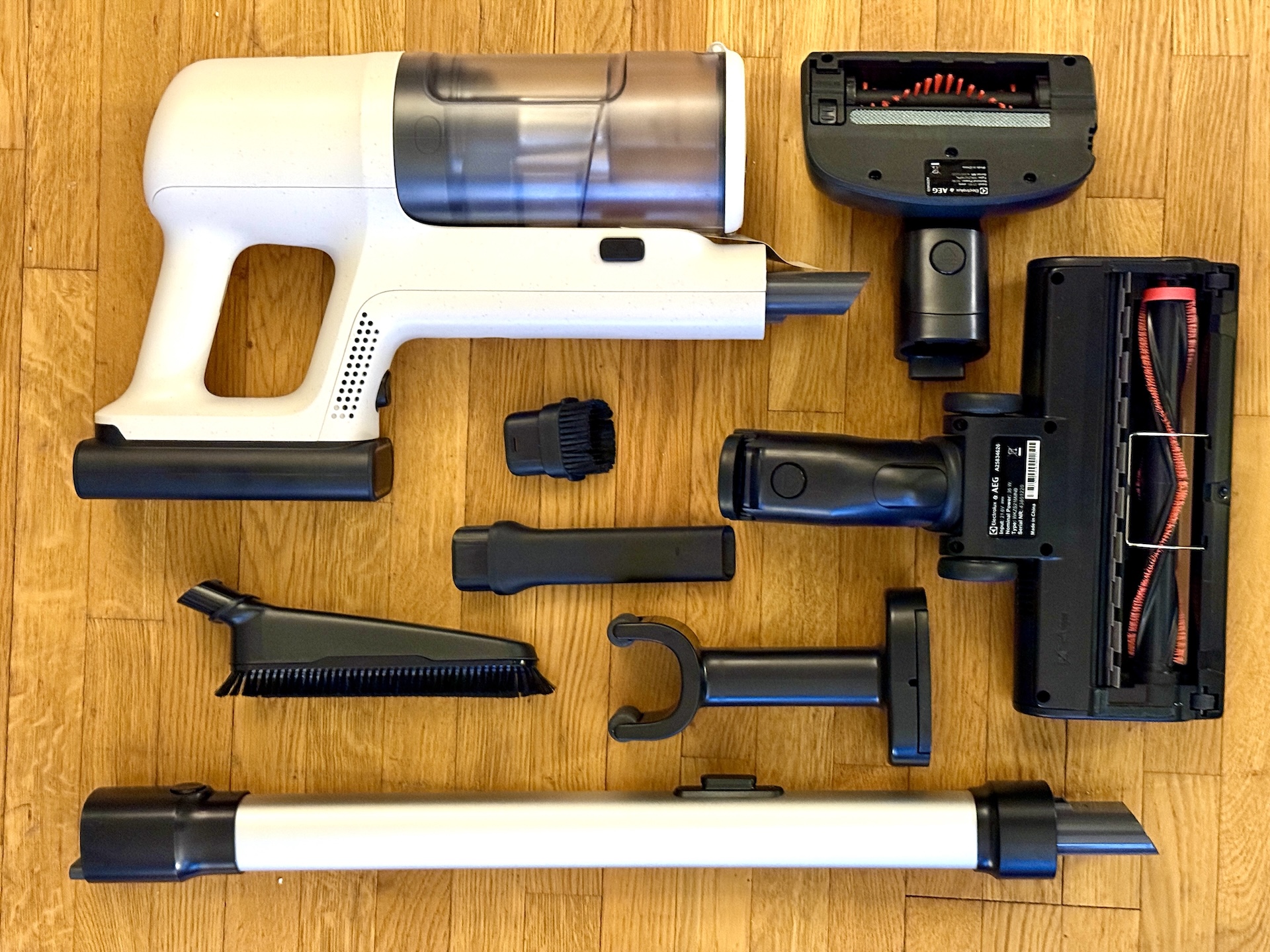 In addition to the large motorised floor attachment, the box includes a narrow crevice brush for tight spaces like radiators, a small brush for dusting small surfaces and a large brush for larger, delicate surfaces. And actually a motorised nozzle with rotating brush for furniture. This is a must if you have pets that shed hair on sofas and beds, and was actually something that was missing from the more expensive model. It also comes with a charger and a simple wall mount. A downgrade from the more expensive model’s excellent floor stand.