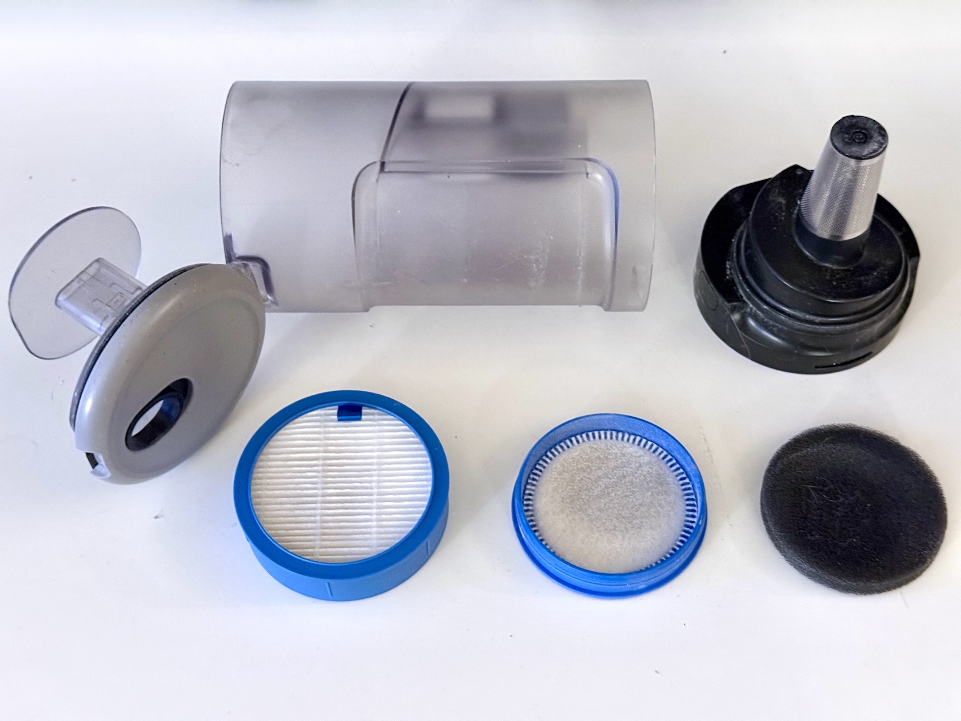 To remove the dust container, simply press a button and pull it out. Then point the underside into the dust container and open the lid and most of it falls straight down. There are no annoying nooks and crannies where dust gets stuck, so it’s easy to get it out. The two filters are easy to pull off and can fortunately be cleaned under the tap. However, one should be replaced once a year and the other twice a year.