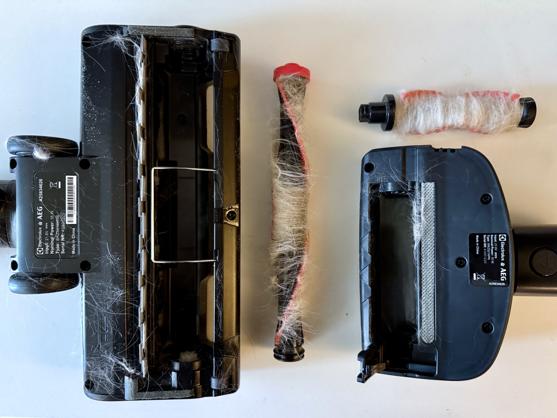 Even the furniture nozzle had issues with tangled hairs, which is almost a little strange as it was designed to remove hair from upholstered furniture. It’s quite effective, but not as good as Dyson’s super nozzle. Fortunately, you can also detach the brush and rake the hairs off. The small dust nozzle is relatively effective, while the large one is probably better for crumbs than dust.