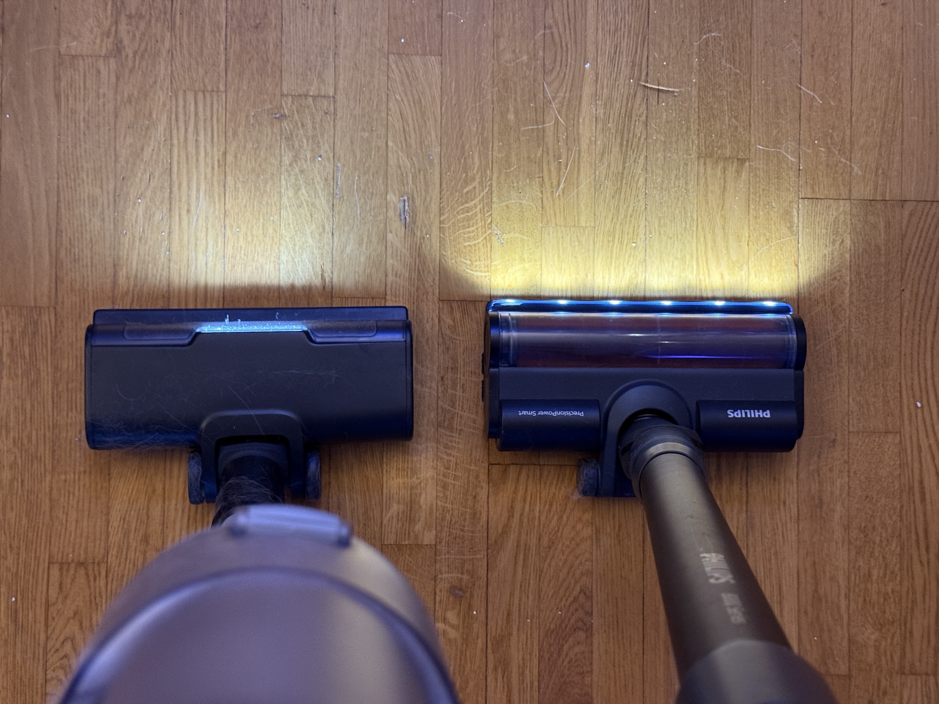 We were pleasantly surprised by the motorised mouthpiece. They usually have trouble being effective on both hard floors and carpets. But there was hardly a speck of dust left on the floor and the carpet was as good as new, even though we left the cats there a little extra before the test. As one of the few mouthpieces we tested, it didn’t get stuck in our short-haired carpet either. If there’s one complaint, it’s that many of the hairs actually get stuck in the brush. This is where many competitors have solutions to minimise tangles. Fortunately, it’s just a two-handed operation to loosen the brush and remove the hairs manually. The LED light is better than nothing, but it doesn’t illuminate dust as effectively as Dyson’s laser.