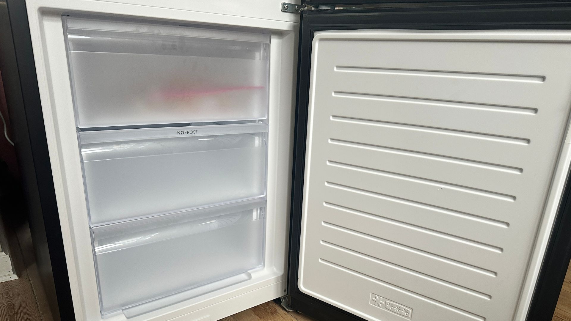 From the outside, the fridge is quite handsome in a masculine way with its charcoal grey steel surface (the manufacturer calls it black, but it’s actually dark grey). Inside, we are greeted by white and grey steel. Here, things look like on most other refrigerators these days.