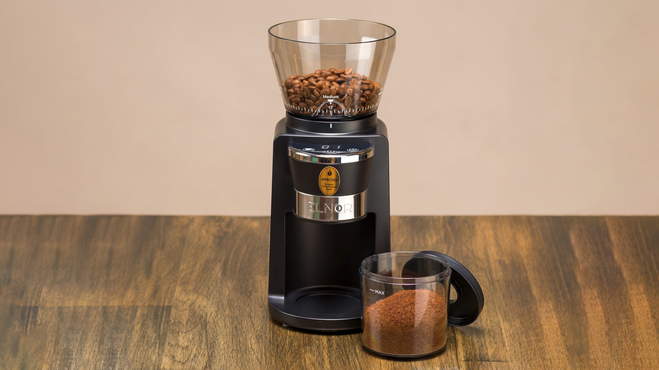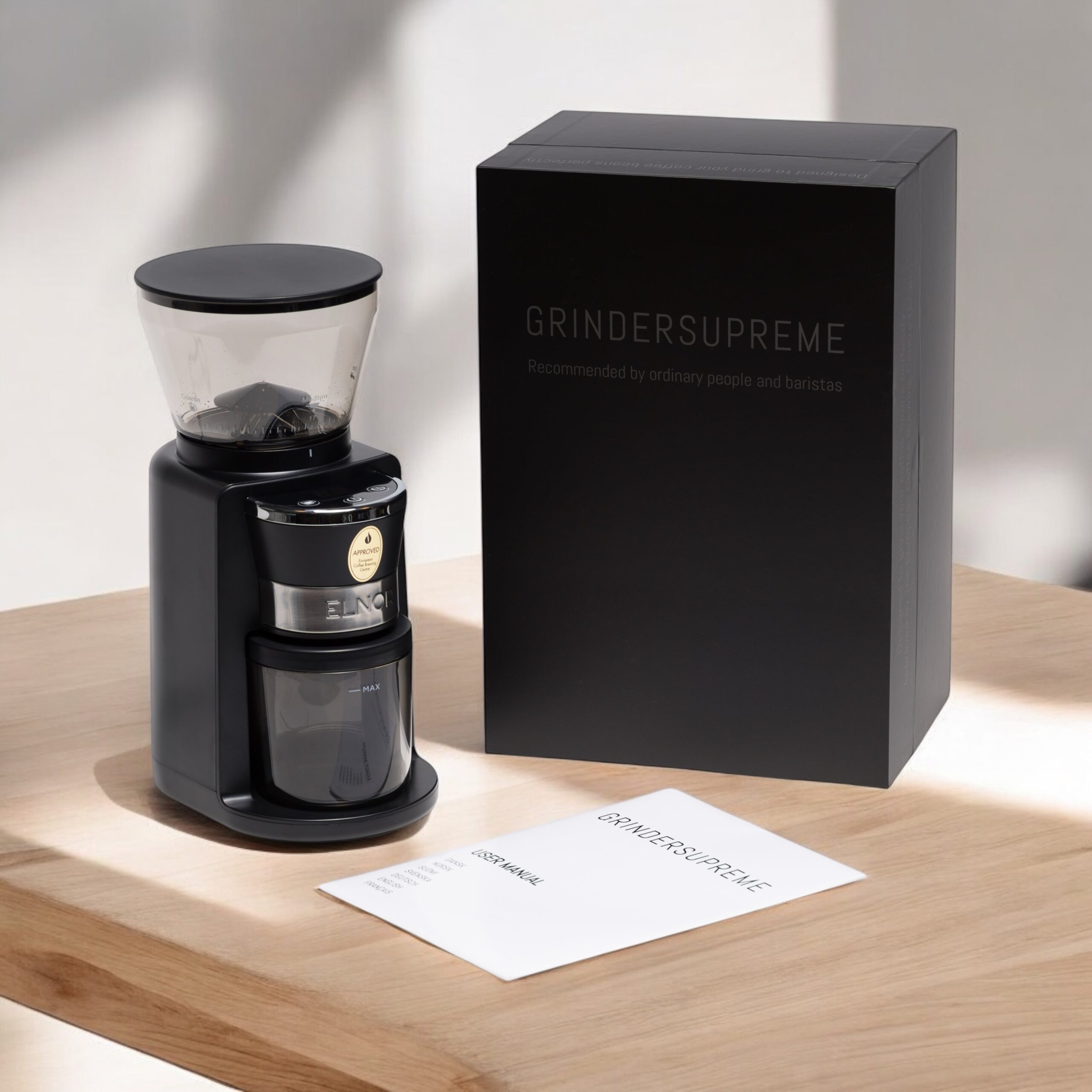 ELNOR/Sabor Grindersupreme delivers delicious freshly ground coffee without breaking the household budget. With ECBC approval, no retention (residual powder) and 34 different settings, it is both precise and reliable.