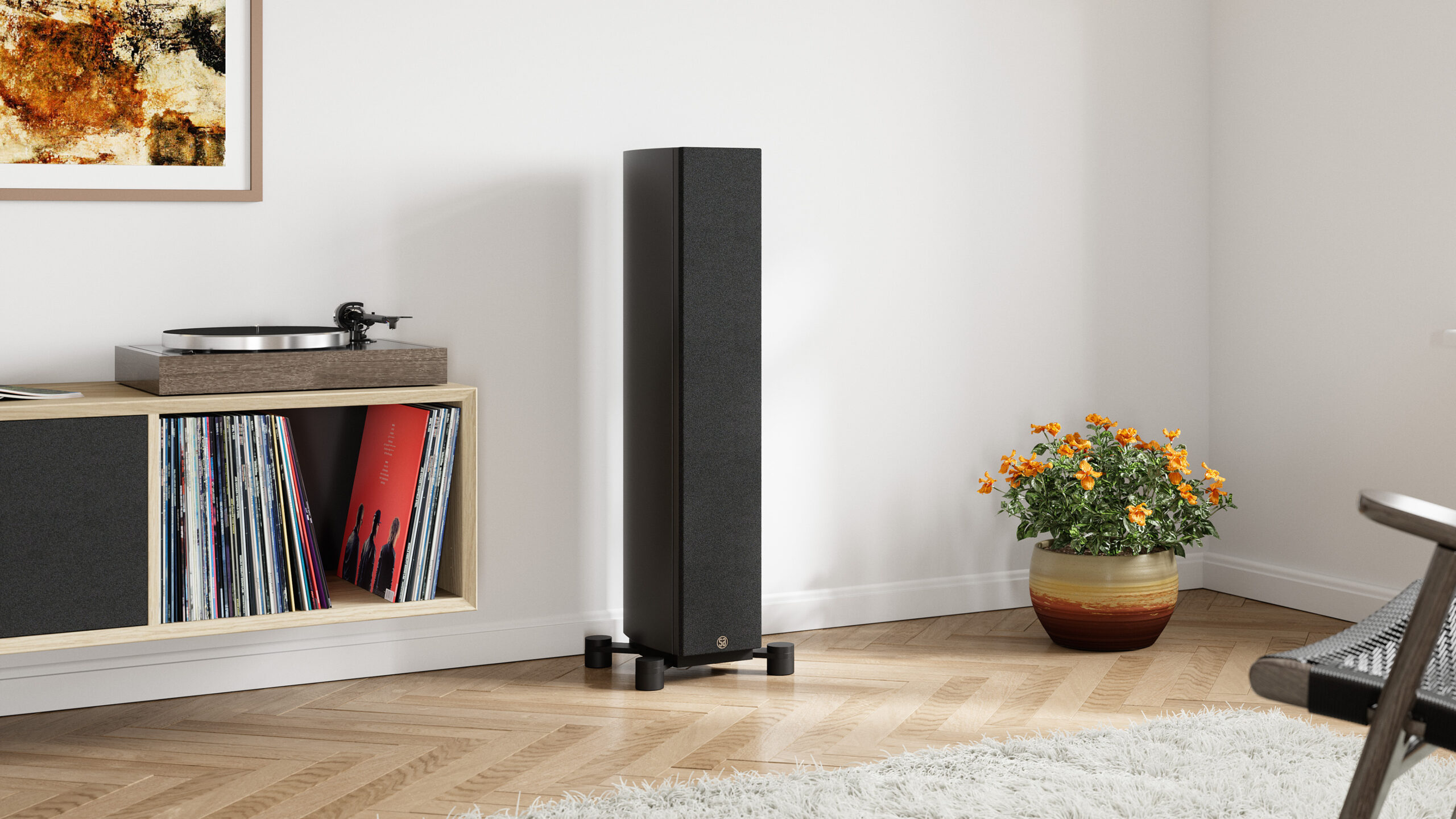 For optimal placement, we recommend approx. 20-40 cm from the rear wall and a listening distance of at least 2.5 metres. The speakers can be adjusted with both rubber pads and the included spikes, depending on the surface.