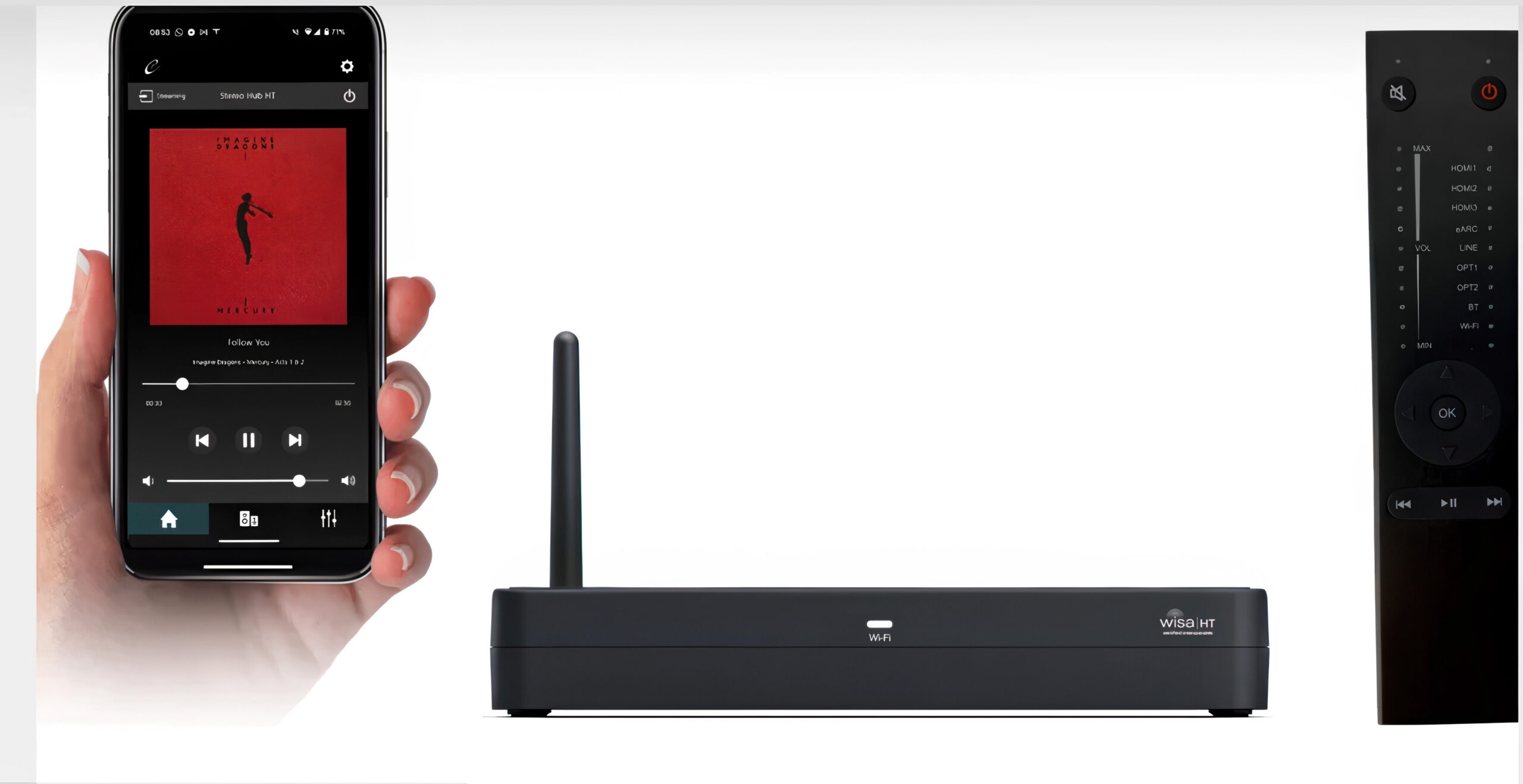 For €4599, you get both the speakers and the Stereo Hub HT. This compact box transmits sound wirelessly to the speakers via WiSA technology on the 5.2 GHz band, far away from the noise of regular Wi-Fi and Bluetooth. This ensures lossless transmission with 24-bit/96kHz resolution and minimal latency.