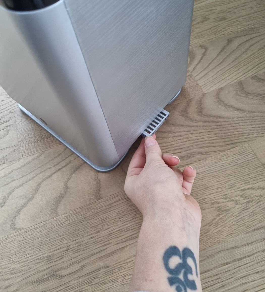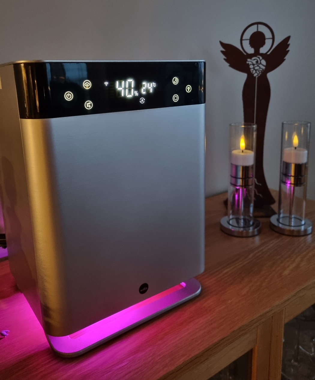 The Wilfa Dew humidifier HU1A-430C is easy to unpack and feels solid and stable. The shape is square and although it’s plastic, it resembles brushed aluminum. On the front there is a large display with touch function. This is a humidifier that, due to its design, works best if placed on a surface elevated slightly above the floor. Unlike other manufacturers, this is not a product that is meant to stand on the floor.