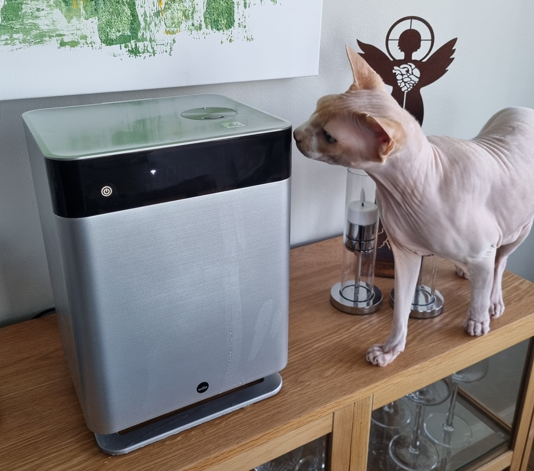 I read that the humidifier should be able to handle rooms up to 70 square meters, and since our entire apartment is 77 square meters, I put it on a sideboard in the kitchen and think that should be enough. The kitchen and living room are connected in a fairly open floor plan and to control the humidity, I place my Airthings View Plus in the living room at a distance of about 7 meters from the humidifier itself.